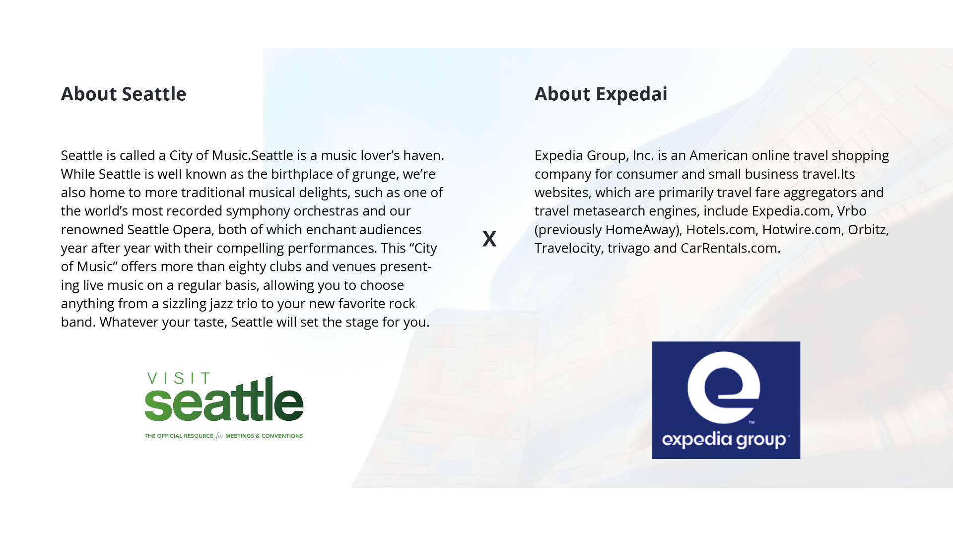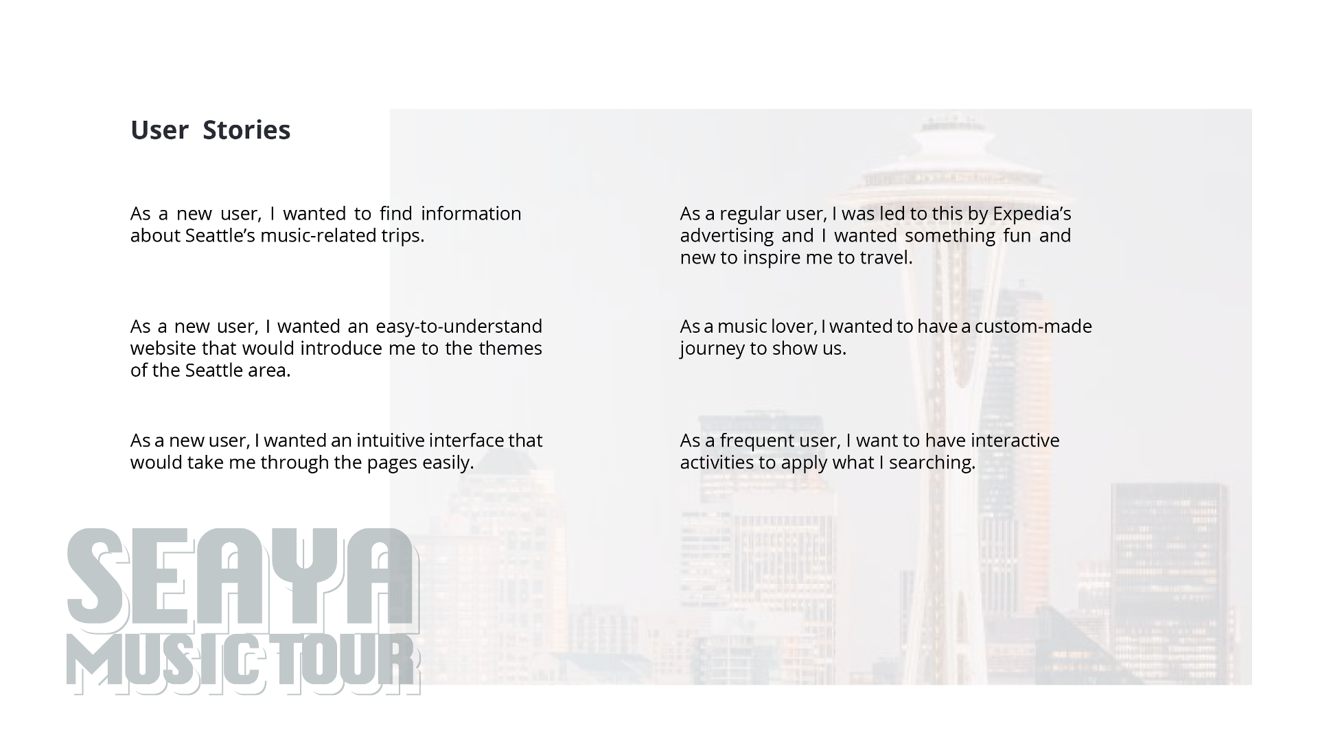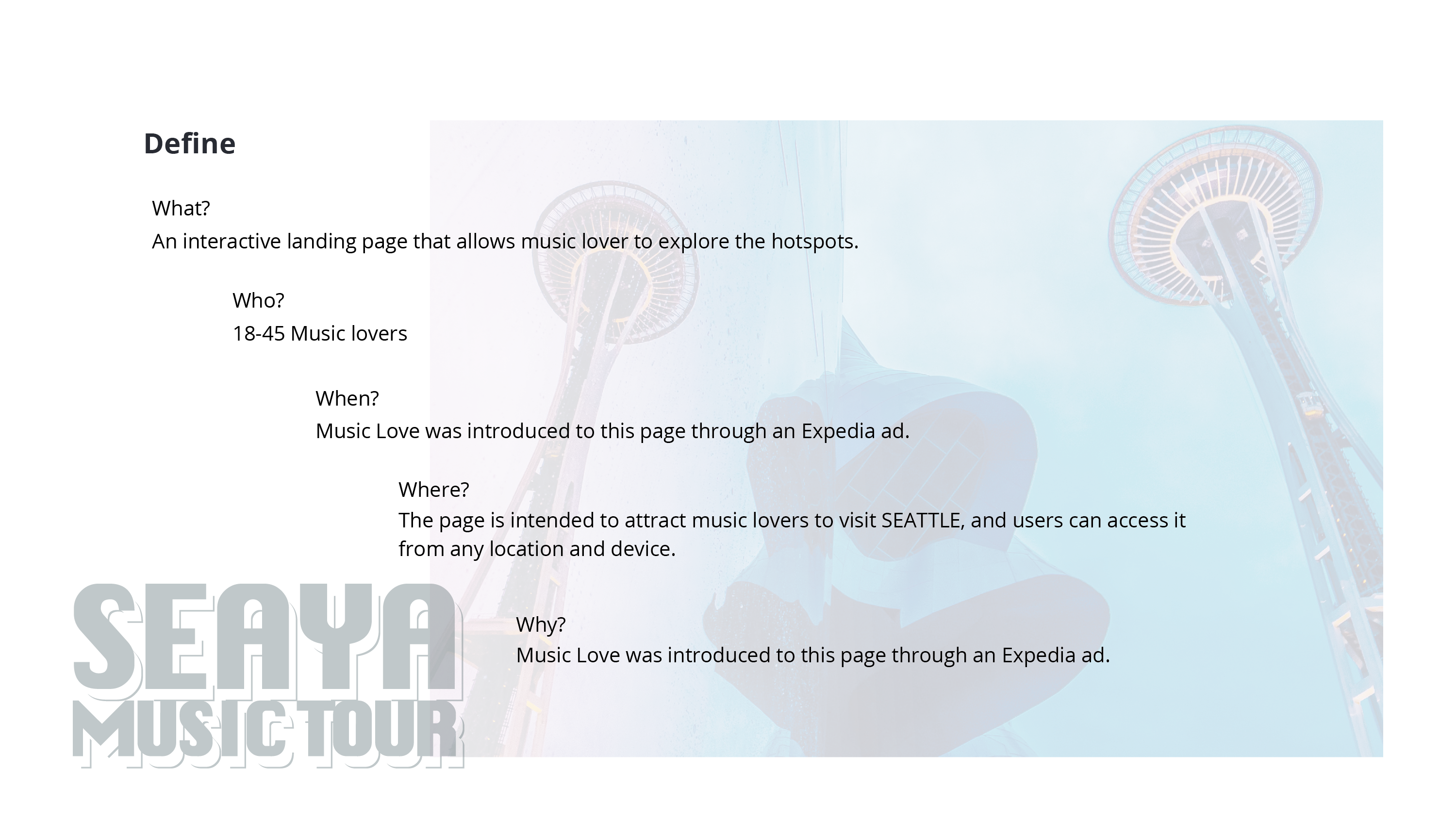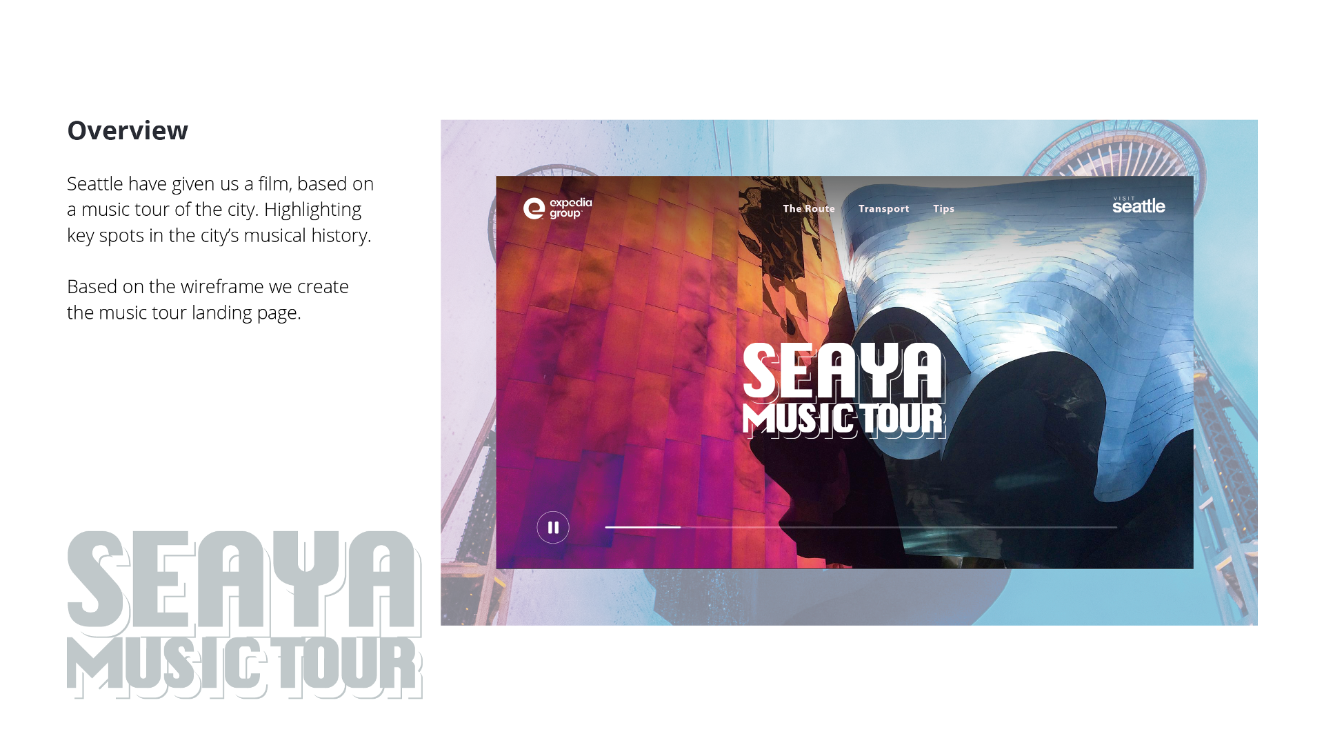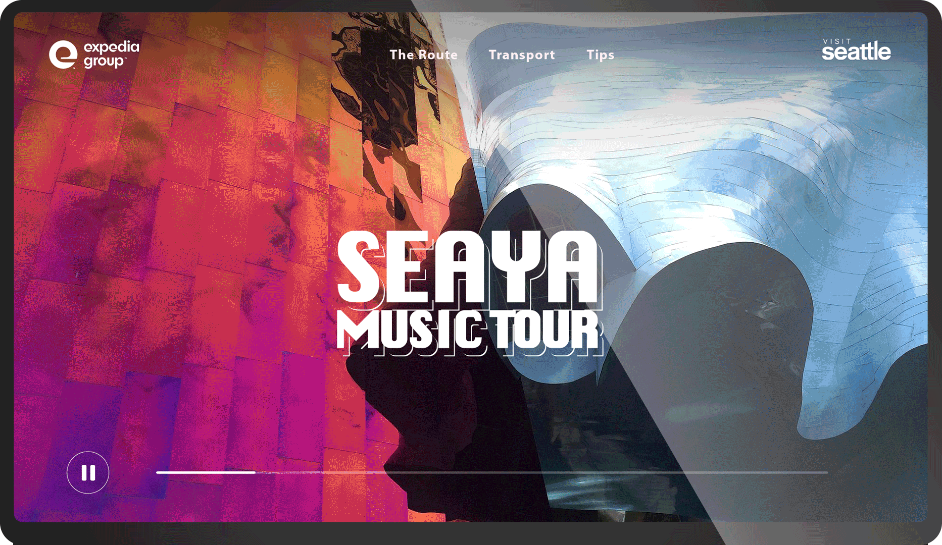The campaign is a collaboration between Seattle and Expedia, the leading travel website, to promote Seattle. It is a responsive web application with a heavy metal music-filled palette and modern imagery that displays beautifully on mobile phone, tablet and desktop.